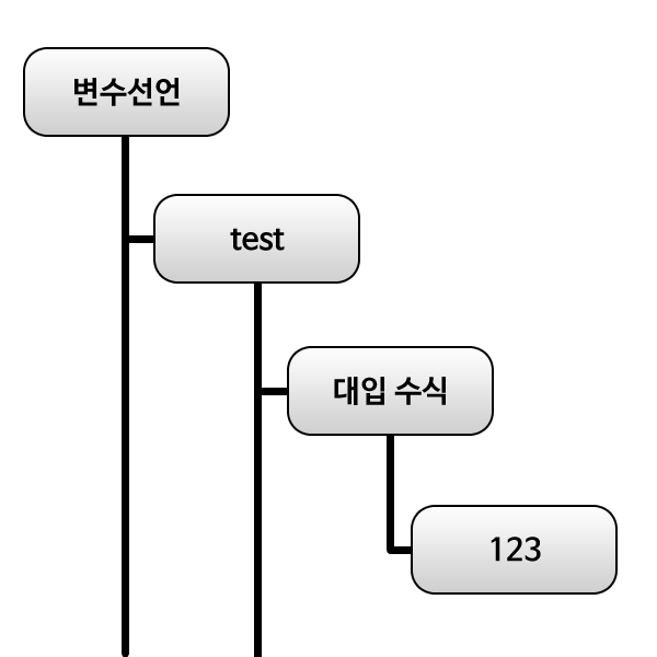 위의 코드의 경우 변수 선언이라는 최상위 노드에서 시작해 test를 확인자로 갖고, 대입 수식이라는 자식 노드를 갖습니다. 대입 수식은 다시 123이라는 숫자 리터럴을 자식 노드로 갖습니다.