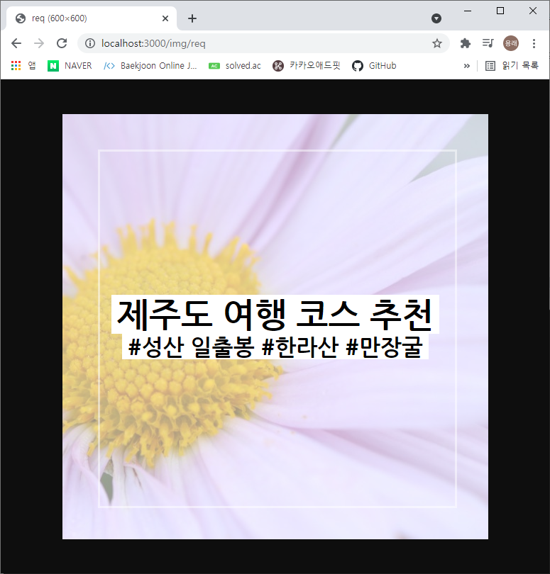 먼저 우리가 만들 썸네일 생성기는 이미지를 배경으로 하고, 가운데의 대제목과 그 밑에 조그만한 부제목으로 이루어진 간단한 형태의 썸네일을 만들어주는 방식으로 작동할것입니다. 그렇다면 먼저 css를 사용해 원하는 이미지의 형태를 잡아주고, 이 모양을 그대로 이미지 파일로 변환하여 사용자에게 제공하는 구조로 동작하면 충분할 것 같습니다.