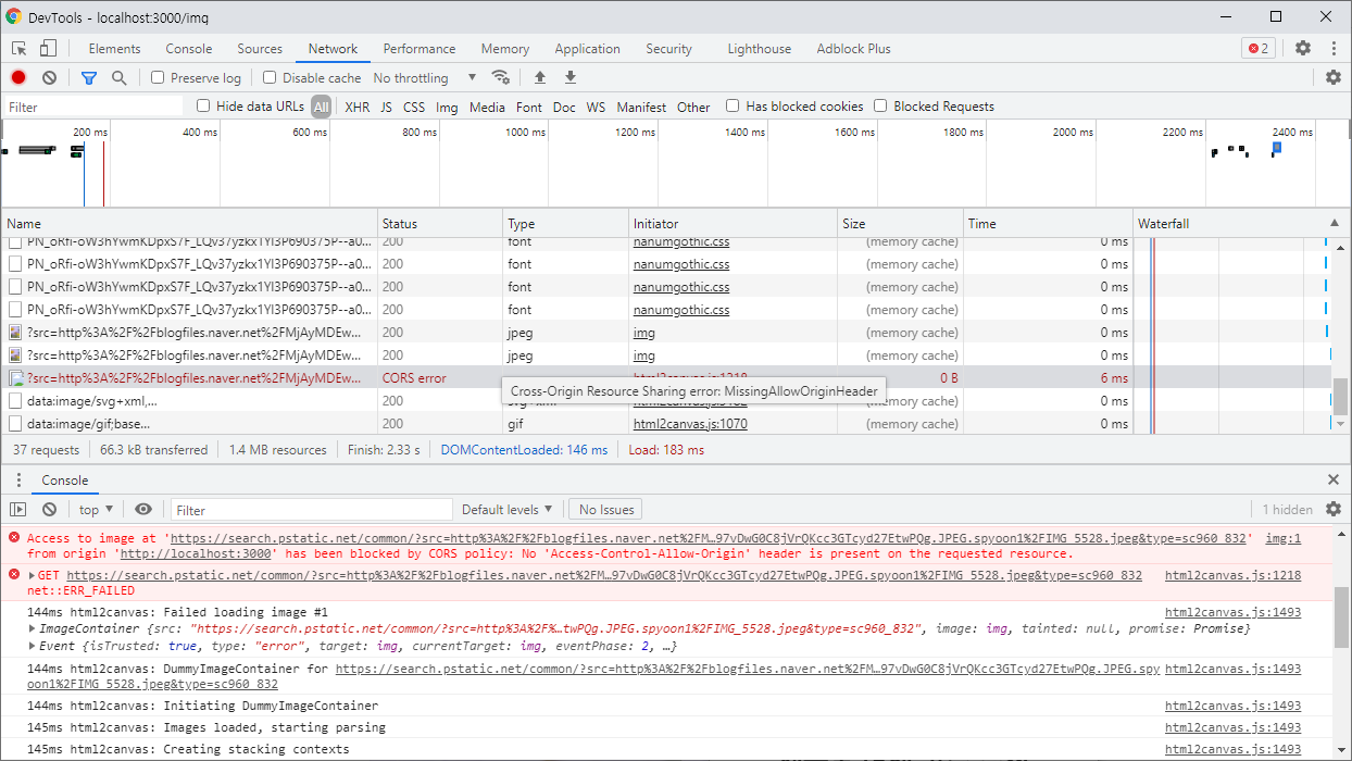 제가 예시로 사용했던 pixabay의 경우, 모든 주소로부터의 접근을 허용하고 있어 이미지를 로딩하고 구성하는데 별 문제가 없었으나 네이버와 같이 외부 접근을 허용하지 않는 곳으로부터의 이미지를 사용했을경우 html2canvas가 이미지를 캡쳐하지 못하는 현상이 발생하였습니다.