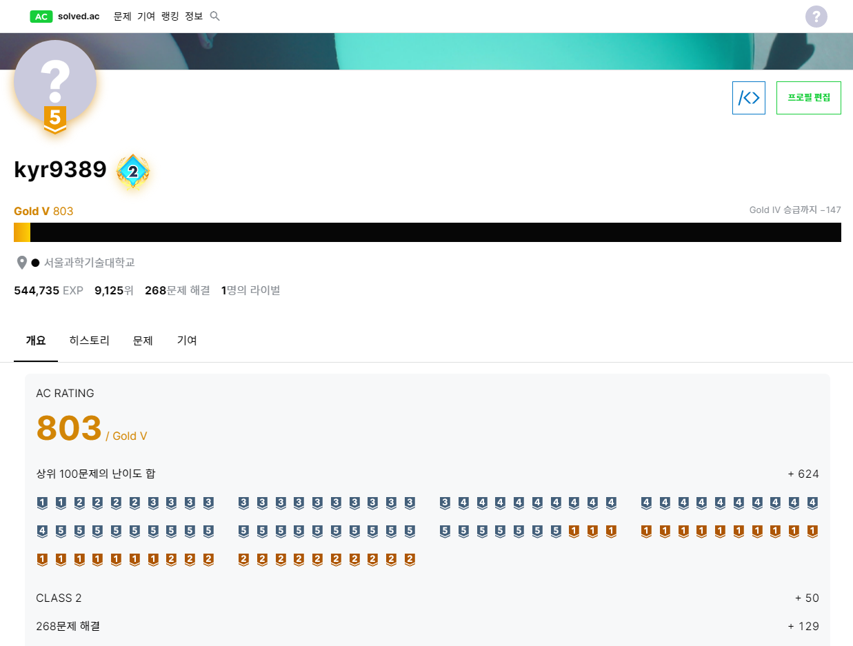 최소한 하루에 한 문제씩은 꼭 풀기로 다짐하고 동아리 부원과 함께 스터디를 진행중인데 오늘 드디어 골드 티어를 찍게 되었네요.