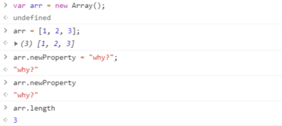 물론 이런 코드는 객체의 속성을 갖고 있다는 점을 보이기 위한 예시일 뿐, 이런식의 활용을 권장하는 방법은 아닙니다. 배열 또한 정해진 용도에 최적화 되어있는 컨테이너이기 때문에 이런식의 프로퍼티를 추가하는 작업을 하려면 일반적인 객체를 사용하는 것이 좋습니다.