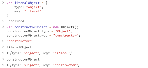 어떤 생성 방식을 사용하더라도 생성되는 객체가 달라지지는 않습니다. 결과적으로 위 두 예시의 객체는 이름과 내부의 값들을 제외하고 같은 Object입니다.