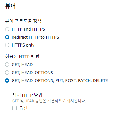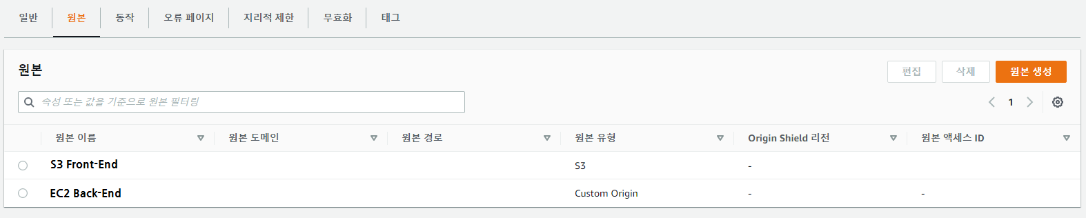 정적 웹 사이트 호스팅이 이루어진 S3에서 직접 POST 요청이 나가지 않도록, S3 프로젝트를 한 번 감싸주도록 하겠습니다. CloudFront를 생성해서 프론트와 백에 연결해줍니다.