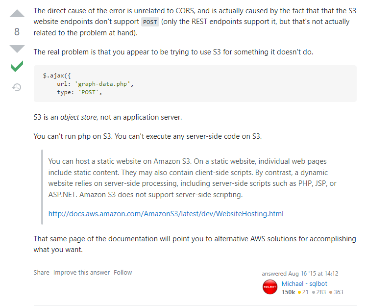 위 글에서 질문자는 php를 사용하긴 했지만, 저와 동일한 오류를 겪고 있었습니다. 답변 내용을 요약하면 S3는 그저 저장소일뿐 어플리케이션 서버가 아니며, S3가 할 수 없는 일(서버-사이드 동작) 을 시키고 있기 때문에 문제가 발생했다. 이었습니다. 하지만 우리는 이미 많은 사람들이 리액트 프로젝트를 S3에 올려서 사용하고 있다는 결과를 알고 있고, 어떻게든 방법은 있다는 것을 유추할 수 있습니다.