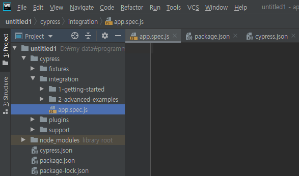 cypress open 시 생성되었던 integration 폴더에 새로운 테스트 파일을 만들어 넣어주겠습니다. 이름은 app.spec.js 으로 지정해주세요. 기존에 생성된 1-getting-started 와 2-advanced-examples 는 지우셔도 무방합니다.