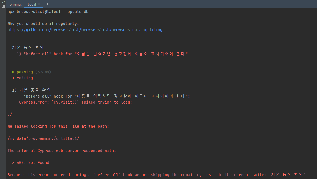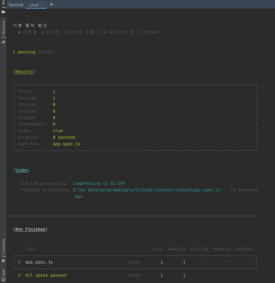 이것으로 CLI에서 실행할 준비가 모두 끝났습니다. 콘솔창에 npm run cypress:run 을 입력하여 실행해봅시다.