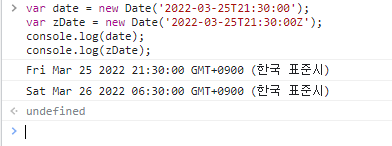 따라서 응답을 받아 온 값에 9시간 만큼을 더해주어야 우리가 보기에 자연스러운 시간이 될텐데, 연산을 하기 위해 Date 객체에 넣어주겠습니다. 제가 사용했던 api를 통해 넘어오는 시간 데이터는 "YYYY-MM-DDTHH:MM:SSZ” 과 같은 형태인데, 다행히 Date() 객체가 인수로 받을 수 있는 형식이니 그대로 적용해보겠습니다.