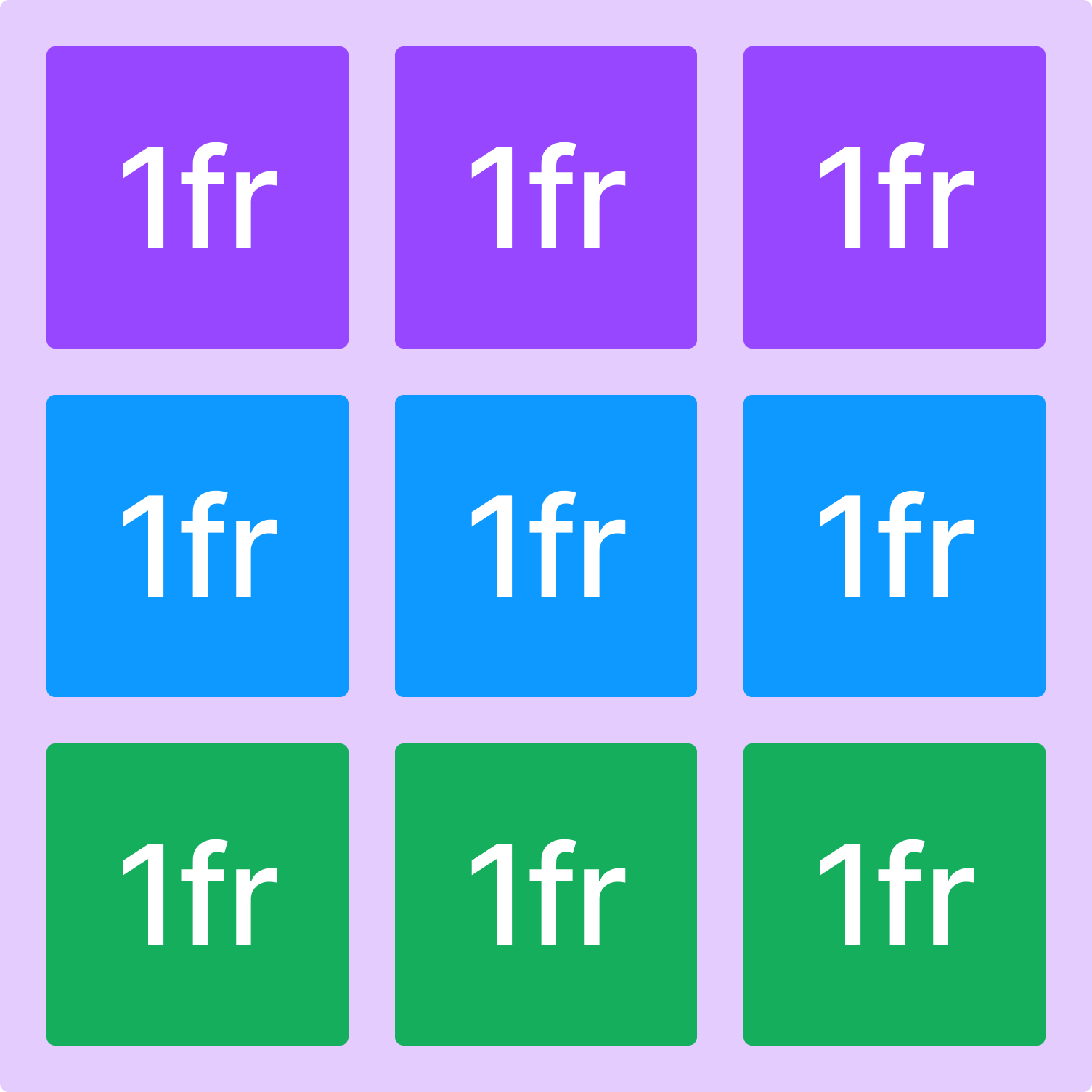 각각의 행에 비율을 설정해주었습니다. 같은 비율로 여러 행을 설정해줘야 한다면 1fr을 반복해서 적는 대신, repeat 키워드를 사용하여 repeat(3, 1fr); 처럼 사용할 수도 있습니다. 또한, 비율이 아니라 100px 처럼 정해진 값이여도 좋습니다.