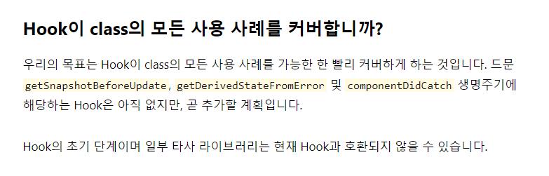 이 외에도 getSnapshotBeforeUpdate, getDerivedStateFromError 등 아직까지 훅이 지원하지 않는 메서드들이 있지만, 이것을 이유로 클래스 컴포넌트를 배우고 사용해야 한다는 것은 아닙니다. 리액트는 이러한 메서드들도 훅에서 지원할 수 있도록 빠른 시일내에 새로운 훅을 공개할 예정이라고 합니다.
