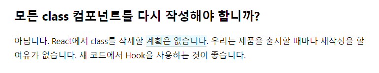결론적으로 이미 클래스 컴포넌트로 작성되었거나, 훅이 아직 지원하지 않는 기능을 다루는 부분에 한해서는 클래스 컴포넌트를 사용하시고 새롭게 작성하는 기능에 대해서는 함수 컴포넌트와 훅의 조합을 사용하시길 권장드립니다.