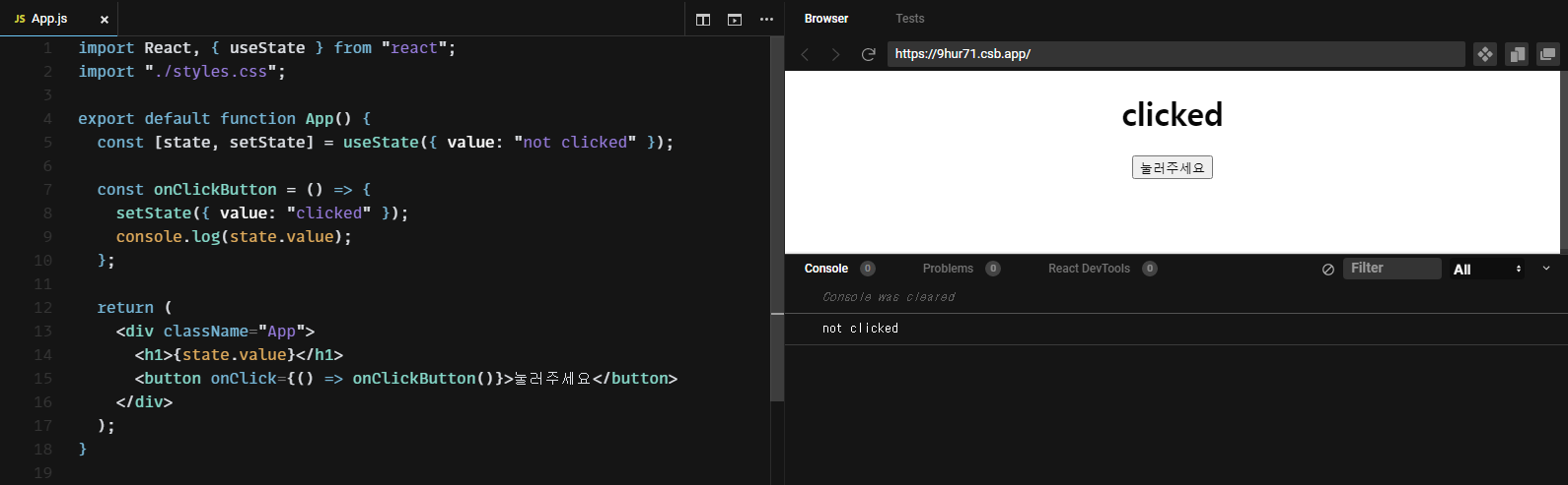 const [state, setState] = useState({ value: "not clicked" });