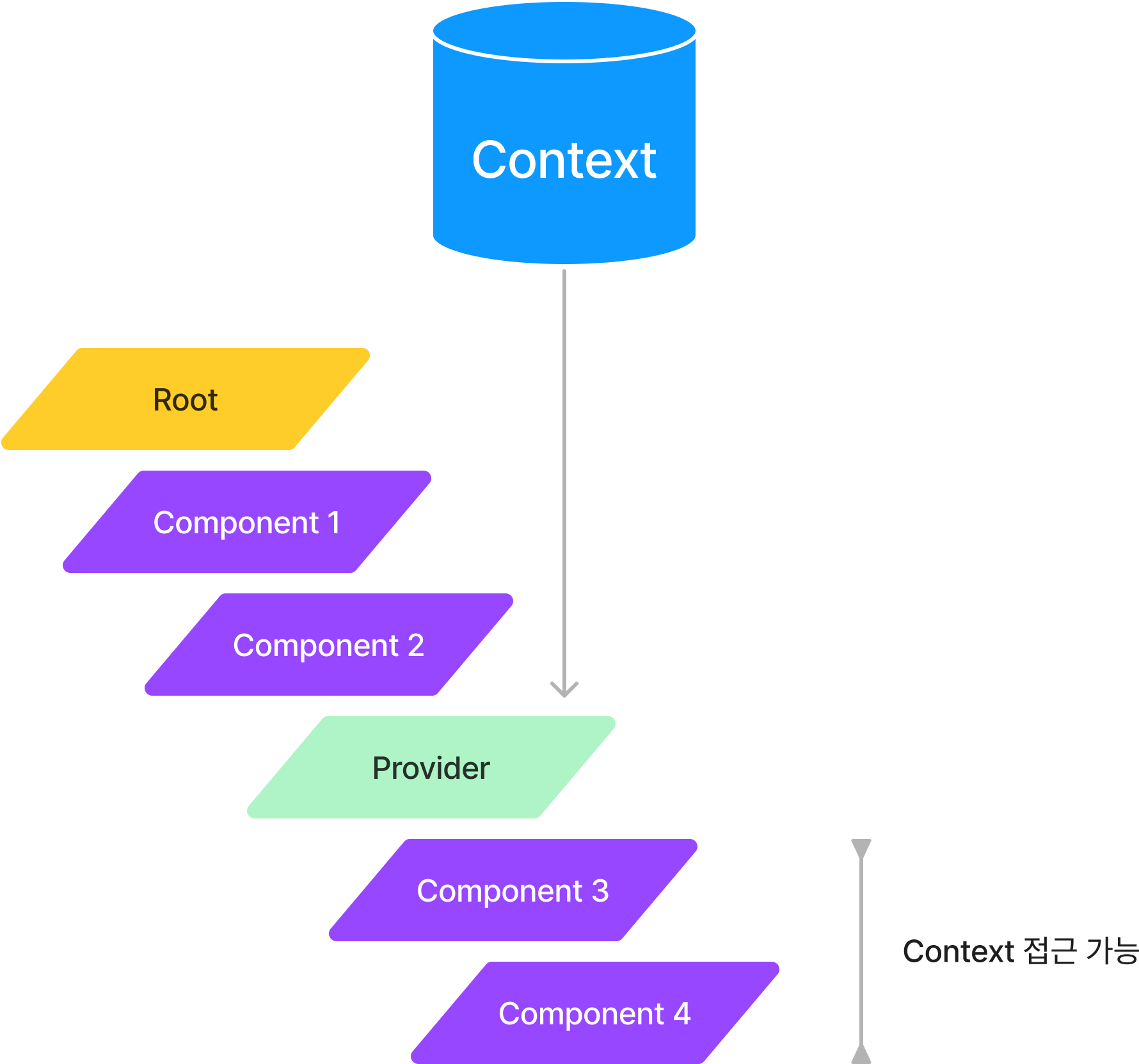 컴포넌트 중간에 Provider를 선언해주면 그 컴포넌트의 하위 요소들부터는 Context에 접근이 가능합니다. 상위 컴포넌트에서 Provider만 선언해준다면 어디에서도 접근이 가능하다는 특성 덕분에 멀리 떨어진 컴포넌트끼리 같은 상태를 공유해야 할 때 특히나 효율적입니다.