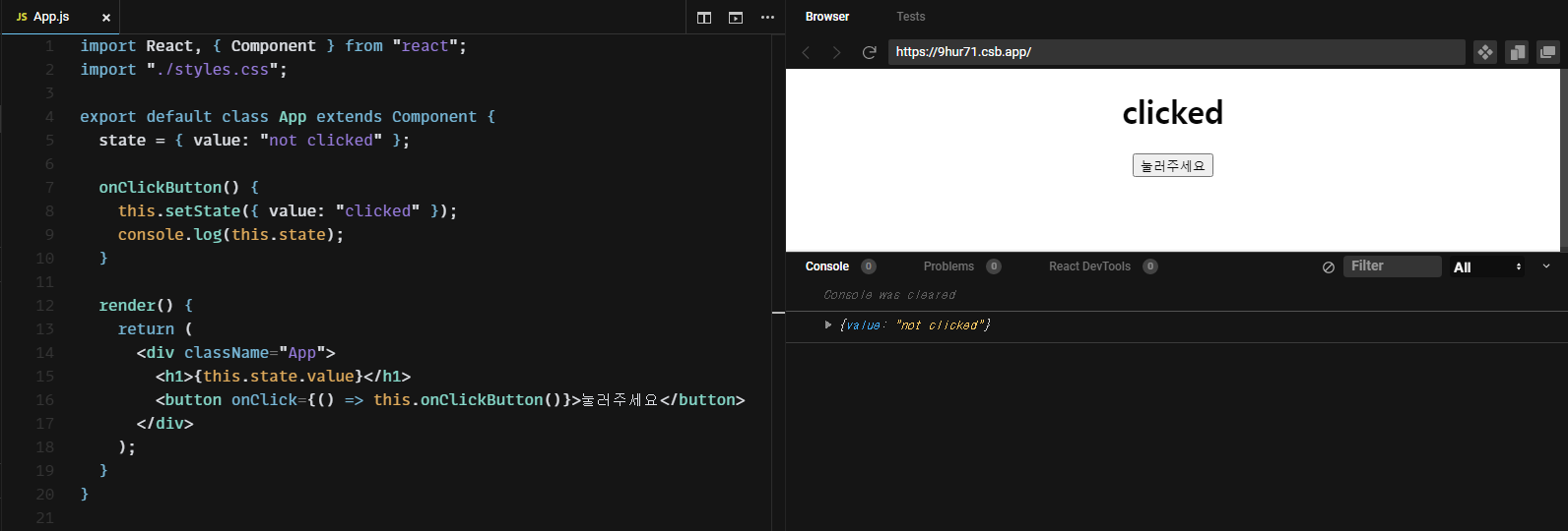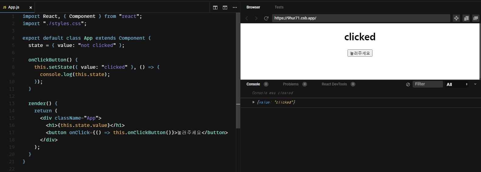 위쪽이 직접 state에 접근하여 변경해주는 경우이고, 아래쪽이 setState를 이용하여 변경해주는 경우입니다. 우리가 예상했던 그대로의 결과를 확인할 수 있습니다.