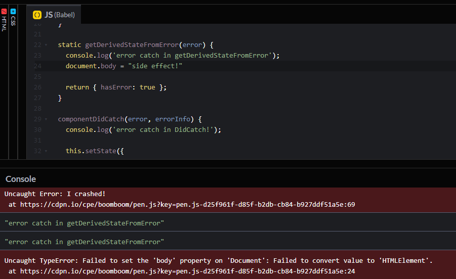 getDerivedStateFromError 메서드는 컴포넌트의 render 단계에서 호출됩니다. 즉, render() 메소드가 실행되기 전에 호출되기 때문에 VDOM에 영향을 끼칠 수 있는 사이드 이펙트가 발생하는 작업을 해서는 안됩니다. 이때는 대신 componentDidCatch 메서드를 이용해야 합니다.