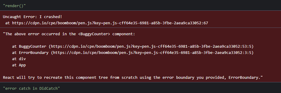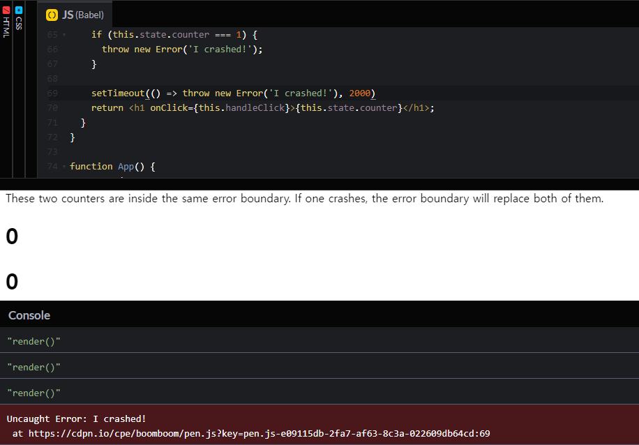 위의 세 가지 경우는 모두 컴포넌트의 범위를 벗어난 곳에서 생긴 에러라는 공통된 원인을 갖고 있습니다. 이번 경우는 컴포넌트의 범위에서 발생하는 에러는 맞지만, 에러 경계 자체에서 발생하기 때문에 잡아내지 못하는 케이스입니다.