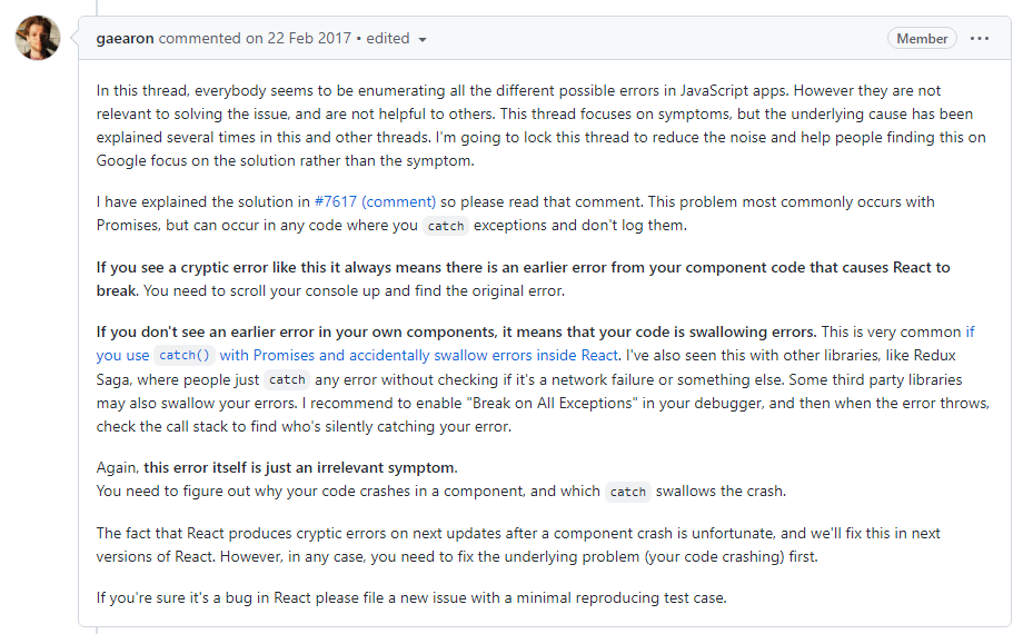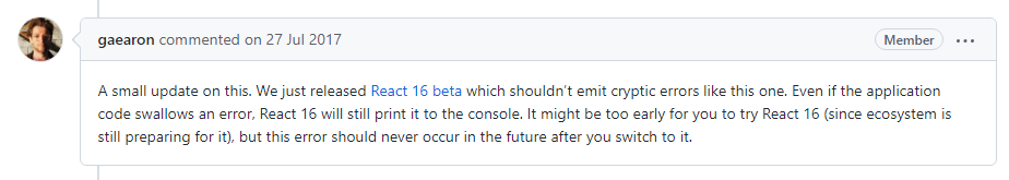 이 스레드를 보면, 리액트 15버젼을 이용하던 사람들이 알 수 없는 문제를 겪었지만 이에 대한 원인을 찾는데 어려움이 많았던 것을 알 수 있습니다. 대부분의 원인은 이전 상태에서 발생했던 에러들로 인해 발생하였지만, 이를 적절히 핸들링하지 못했고 이는 결국 애플리케이션의 다음의 동작에도 영향을 미쳤던 것입니다.