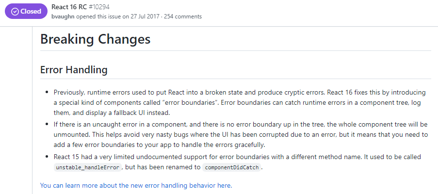 이에 대해 리액트의 개발자인 Dan Abramov는 컴포넌트에서 발생한 에러들을 적절히 핸들링 할 수 있는 방법의 필요성을 느꼈고, 그 대안으로 리액트 16버젼부터 사용할 수 있는 에러 경계가 스펙에 도입되었습니다.