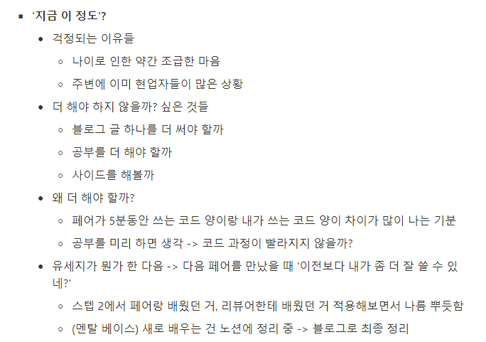저 상담 이후로 흔들렸던 멘탈이 대부분 잡혔다. 다른 크루와 비교하지 않고, 페어 프로그래밍을 하며 부족한 점을 느끼면 오히려 새로 배울 수 있는 기회로 삼아 적극적으로 가르침을 받았다. 마음가짐이 달라져서인지, 학습에도 탄력을 받아 쑥쑥 성장하기 시작했다.