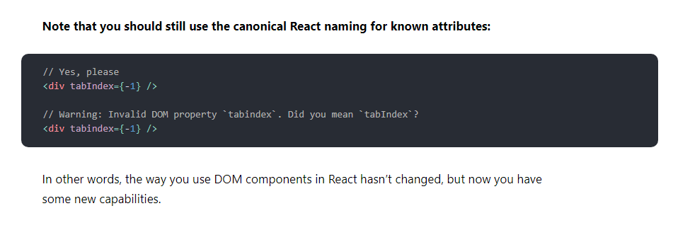 저는 이러한 현상이 다소 이해가 되지 않았습니다. 리액트에서 별 문제없이 정상적으로 사용할 수 있는 이름들인데, 왜 콘솔창에서는 이러한 친숙한 이름을 두고 오류를 띄우고 은근히 다른 이름을 사용할 것을 권유하는걸까요?
