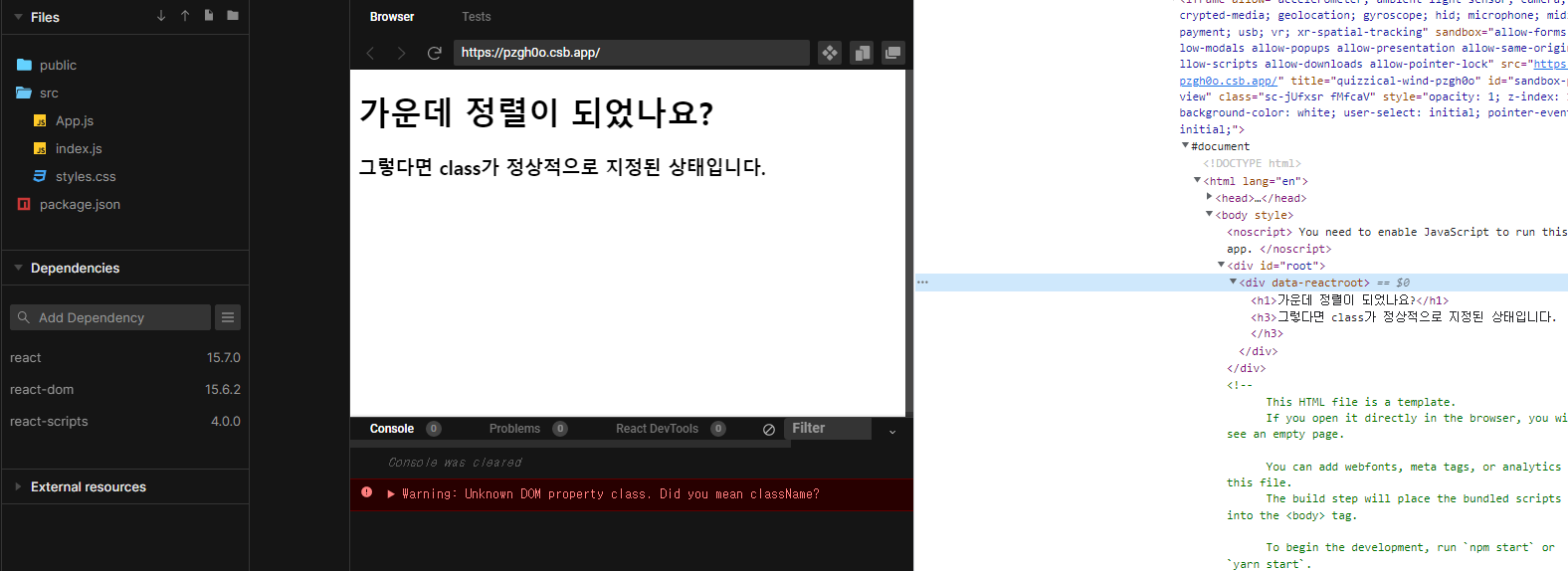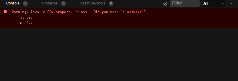 JSX에서는 클래스 어트리뷰트를 붙일때 class 대신 className을 사용하도록 권장합니다. 이를 무시하고 class를 사용하면 콘솔창에 warning이 표시됩니다.
