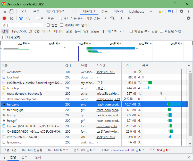 그냥 webp 파일로 변경했을때엔 용량 494kb에 로딩 시간 16밀리초가 된 반면, 압축 퀄리티 지정과 리사이징을 적용해주니 용량 78.8kb에 로딩 시간 10밀리초가 되었습니다. 원본 png 파일이 10mb가 넘어가던걸 생각하면, 극적인 변화가 아닐 수 없습니다. 지난 시간의 js 최적화와는 비교도 되지 않을 정도로 사이트 로딩 속도가 빨라진게 체감이 되었습니다.