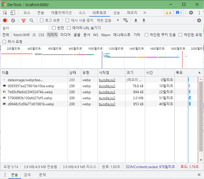 위 그림은 이번에 성능 개선을 진행하던 프로젝트를 기준으로, 네트워크에 요청한 각 파일들이 가진 크기를 형식별로 나누어 그래프로 나타낸 그림입니다. 확실한 비교를 위해 이전 글에서 진행한 자바스크립트 최적화를 적용하지 않은 상태로 비교하였습니다.