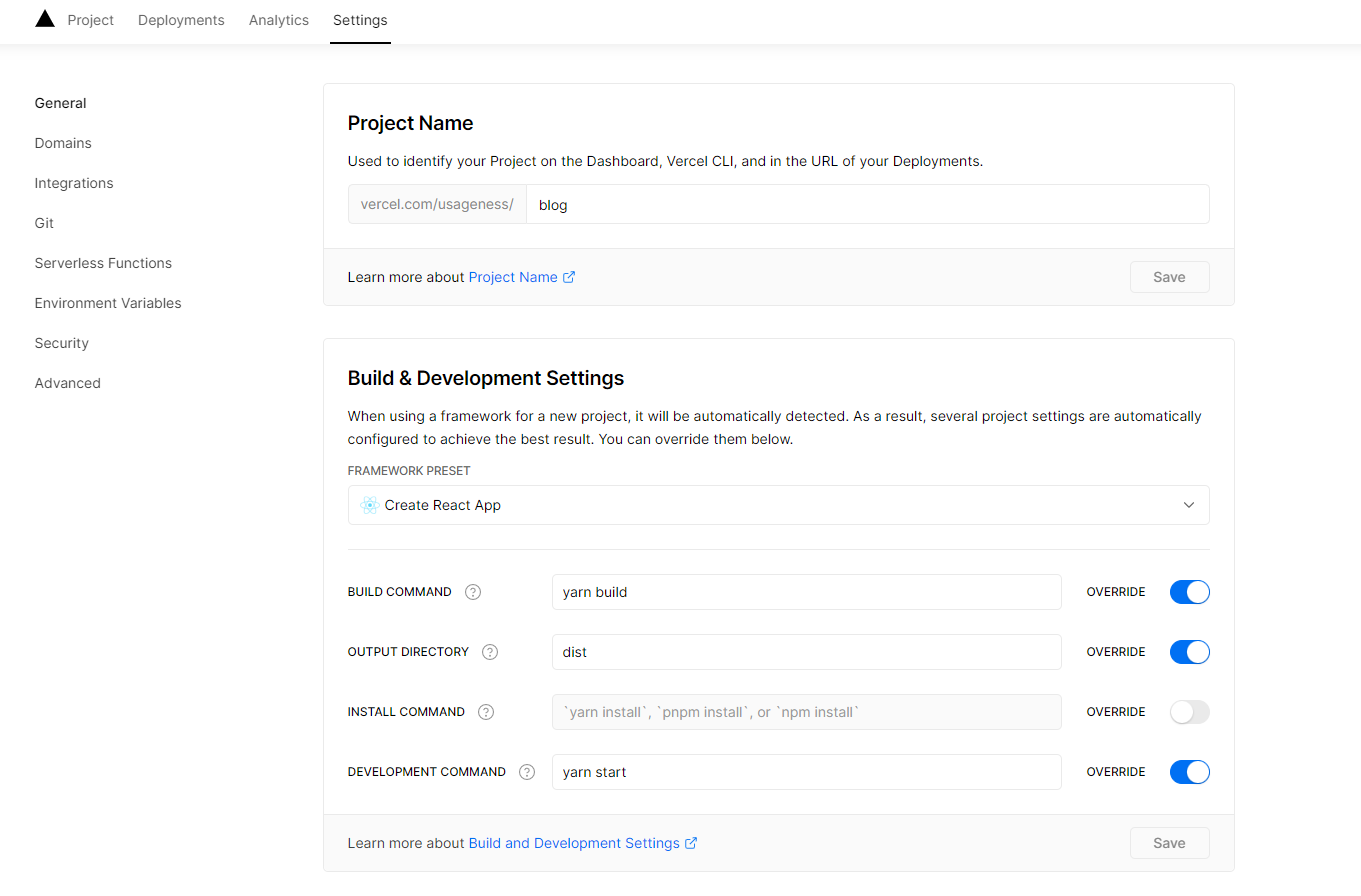 Vercel에 가입하고, 레포지토리를 연결하여 간단히 배포 설정을 하면 됩니다. 한 가지 단점은, vercel이 yarn berry의 pnp를 지원하지 않는 것 같습니다. Install Command를 오버라이드 하도록 설정하고 비워두면 pnp로 설정된 프로젝트라 바로 빌드할 수 있어야 하는데 오류를 발생시키고, 빌드에 실패합니다.