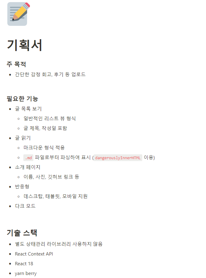 새 프로젝트이니 먼저 기획을 해보기로 했습니다. 만들게 될 블로그에는 어떤 기능들이 필요할지 구체적인 내용은 빼고 정말 간단하게만 정리했습니다.