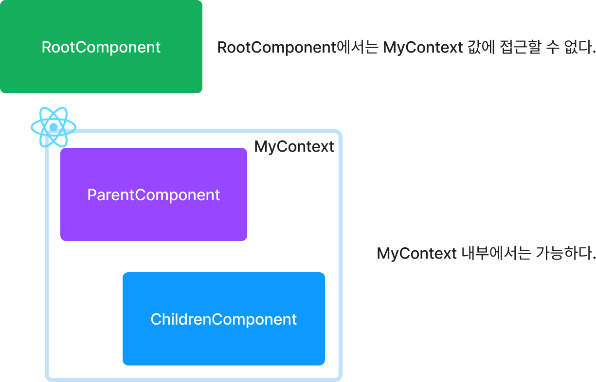 코드를 보시면 Provider가 ParentComponent를 감싸주고 있는 형태입니다. Context를 사용하더라도 리액트는 항상 단방향 데이터 바인딩을 해주고 있기 때문에 사실 최상단 컴포넌트에서 State를 선언하고 있는것과 같다고 생각하셔도 무방합니다. 따라서 당연하지만 Provider가 감싸지 못한 외부에서 해당 값에 대한 접근은 불가능합니다.