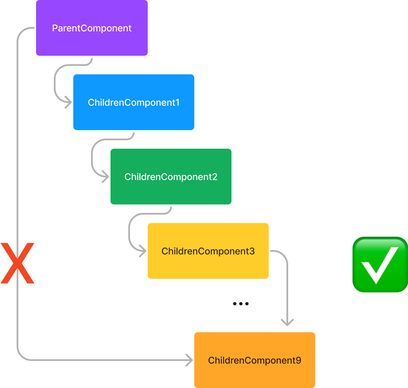 부모 컴포넌트에 있는 데이터가 아래쪽에 있는 컴포넌트에서도 필요한 경우, 해당 데이터를 한 번에 전달해 줄 방법이 없고 그 사이에 있는 모든 자식 컴포넌트들을 거쳐서 전달해야합니다. 이런 데이터들이 많아질수록 컴포넌트의 인자들은 각종 Props들로 자연스럽게 두툼해지기 마련이죠.