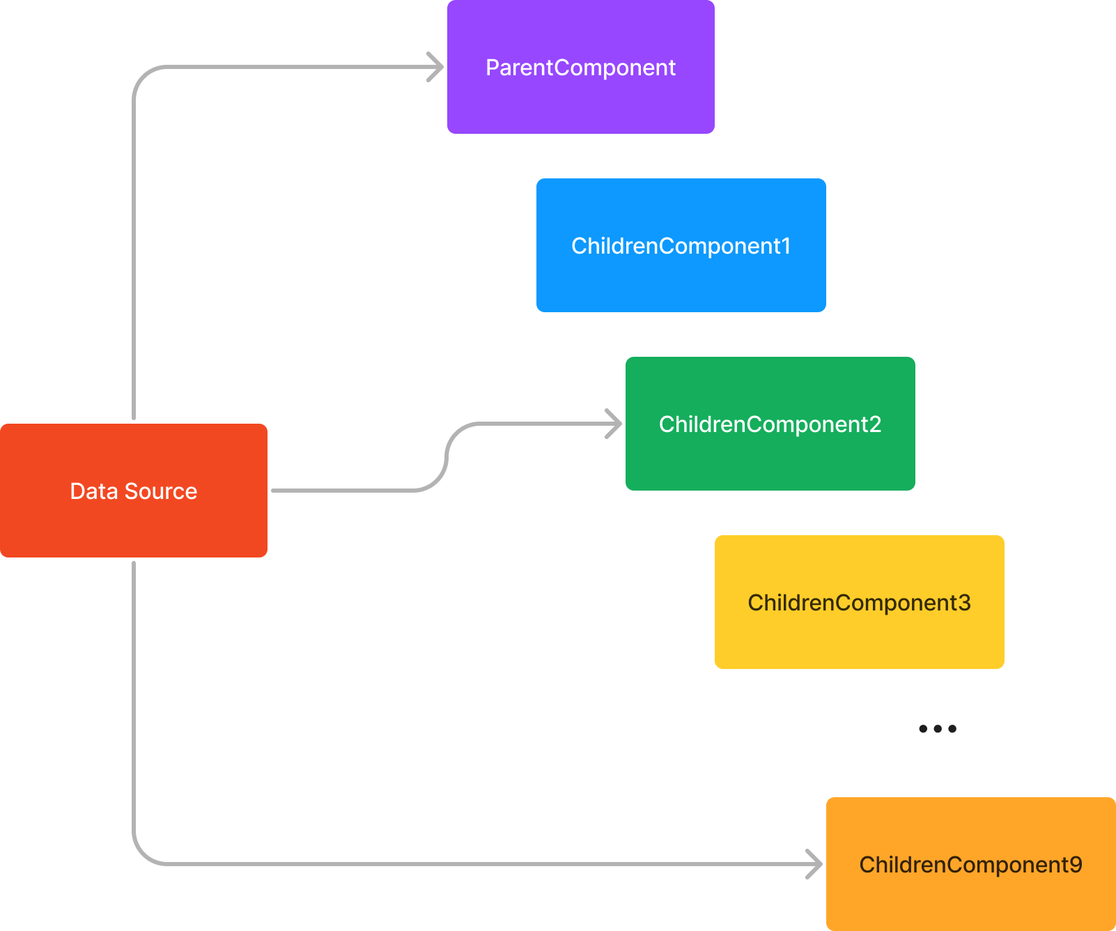 이렇게 많아진 Props들은 보기에도 복잡하고 컴포넌트 관리에도 어려움을 주게 되었습니다. 그렇다면 중간중간 Props를 전달하지 않고도 데이터를 받고, 업데이트 할 수 있다면 이러한 복잡성이 많이 해소되지 않을까요? 위 예시 그림에서 ParentComponent에서 Props를 통해 전달하는게 아닌, 데이터가 필요한 각 컴포넌트에서 어떠한 공통된 출처로부터 데이터를 받아올 수 있는 구조라면 가능하지 않을까요?