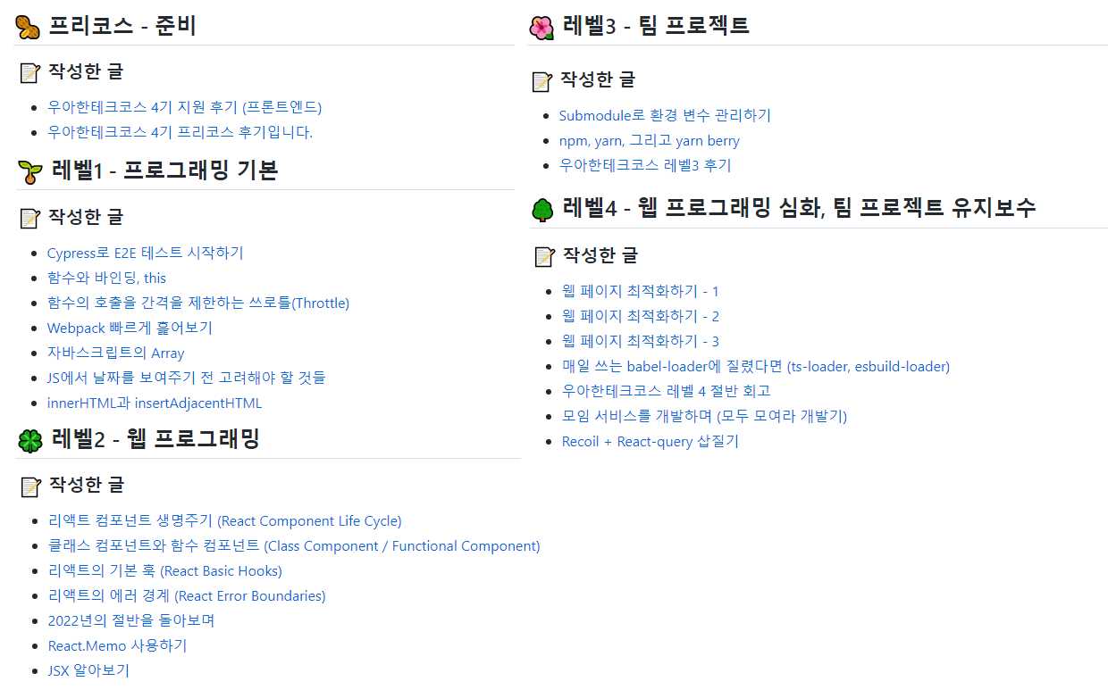 우테코를 진행한 2022년은 제 인생에서 가장 많은 양의 기록을 남겼던 해였습니다. 블로그, 노션, 문서 프로그램 등 가리지 않고 공부한 내용들과 매 순간마다 느꼈던 점들을 정리했습니다.