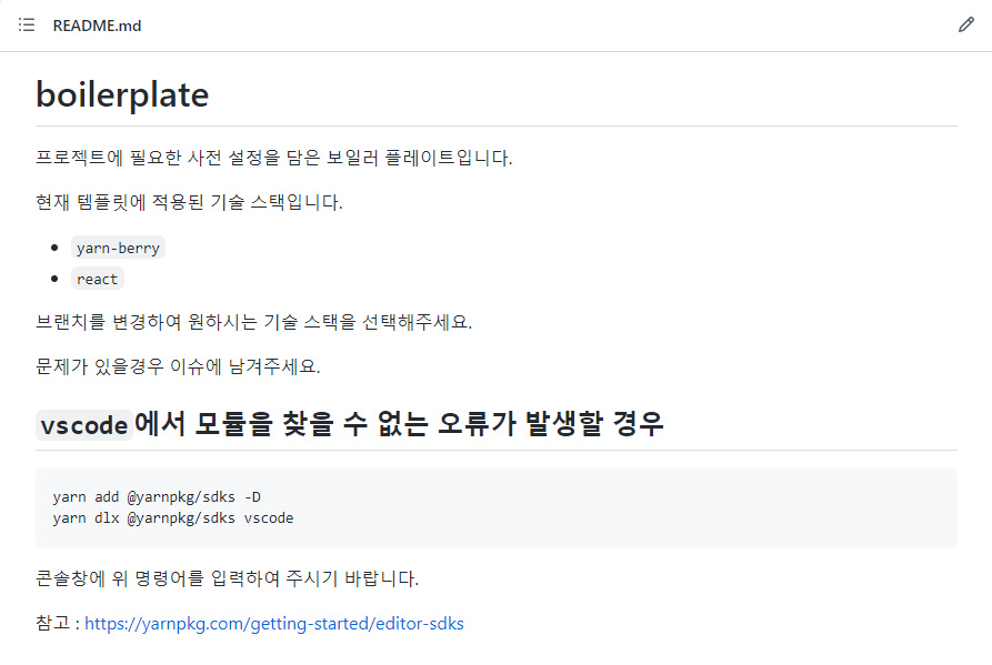 본격적인 구현을 위해 이전의 프로젝트 내용들은 지워주고, 이럴때를 위해 만든 보일러 플레이트를 불러와서 적용하였습니다. 보일러 플레이트는 yarn-berry와 react, typescript 개발 환경이 적용되어 있습니다.
