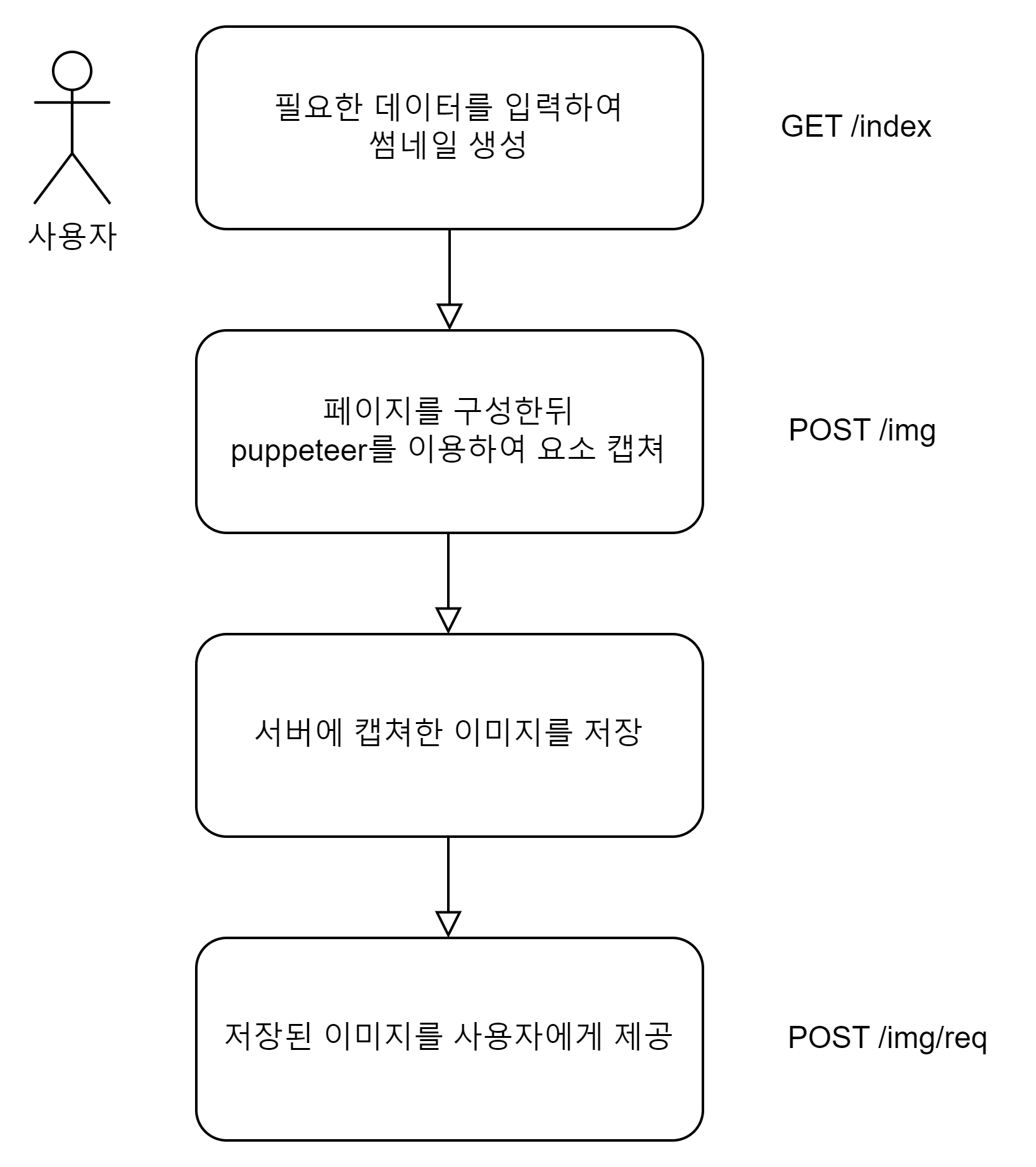 잠시 고민을 해보니 적절한 구상이 떠올랐습니다. 사용자가 입력한 데이터를 프로그램이 관리하고, 이 데이터를 토대로 Canvas에 썸네일을 그려서 이미지 파일로 내보내주는 동시에 현재 작업 내용을 보여줄 수 있도록 실시간으로 표시해주면 될 것 같았습니다. 또한 이렇게 하면 굳이 Express 서버를 돌릴 필요없이, 정적 페이지로도 충분히 구현할 수 있게 됩니다. 정적 페이지로 구현할 수 있다는 것은 곧 서버 호스팅 없이도 비교적 쉽게 배포할 수 있다는 의미입니다.