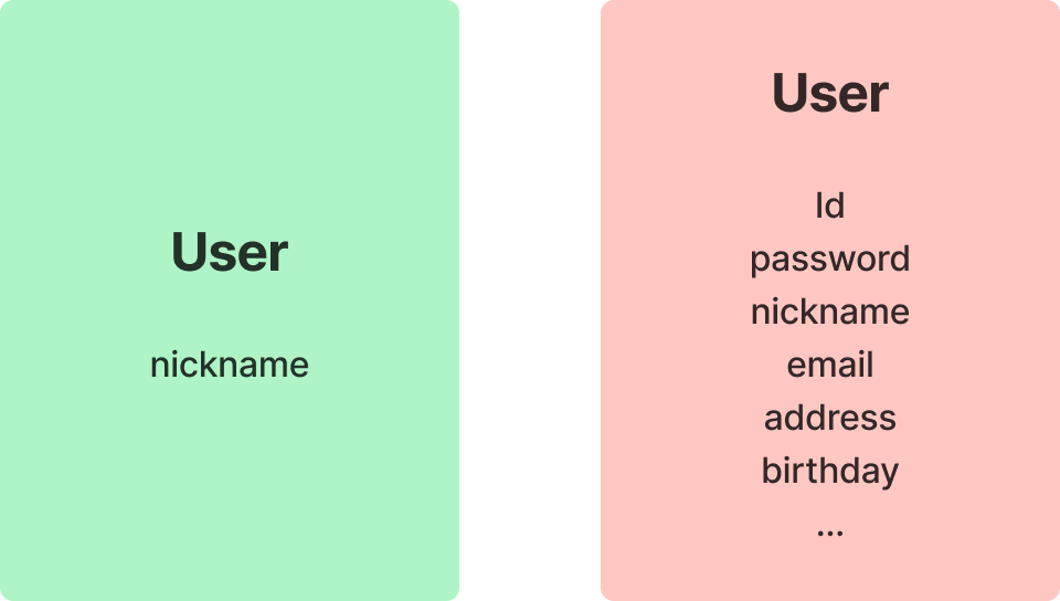 만약 응답으로 모든 정보를 반환해준다면, 받는 쪽에서는 넘어온 데이터를 통해 감추어 둔 내부 필드나 메서드를 알게 됩니다. 이러한 정보들을 많이 알면 알수록 그만큼 끼칠 수 있는 영향력은 커지게 되고, 그에 따라 문제가 발생할 확률은 높아지게 됩니다.