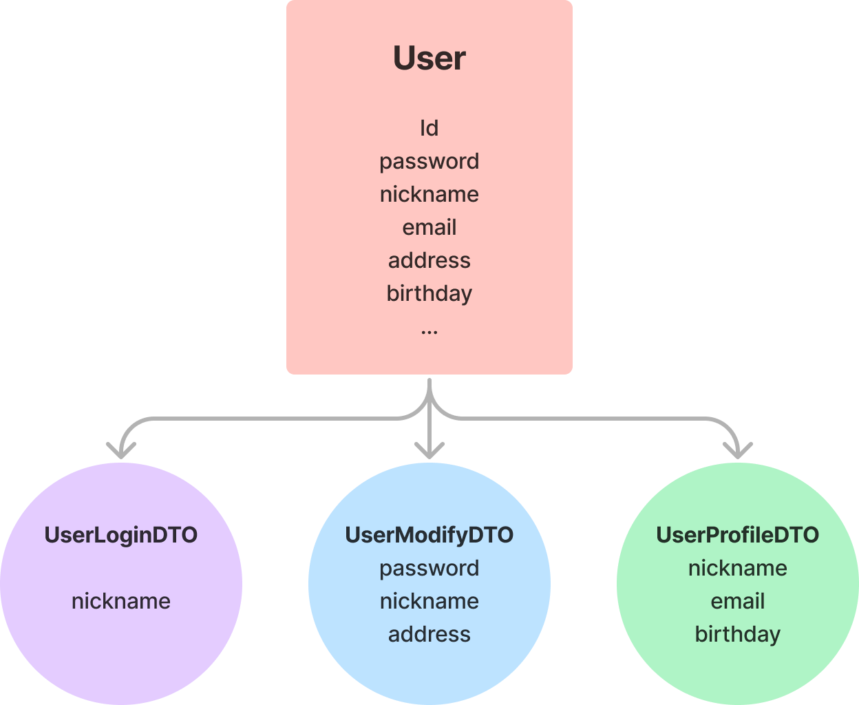 예시로 로그인 기능을 구현해야 한다고 가정해보겠습니다. 실제로 유저라는 도메인이 갖고 있는 데이터들은 굉장히 많지만 그 중 로그인 요청과 응답에 필요한 데이터들은 한정적입니다. 로그인에 성공했다고 해서 유저 테이블에 있는 모든 정보를 넘겨줄 필요는 없겠지요. 당연하게도 필요한 정보들만 선별해서 넘겨주는 것이 효율적입니다.
