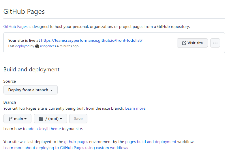 이전에는 라이브러리를 이용해서 gh-pages를 만들고 진행했어야 배포가 됐는데, 클릭 몇 번으로도 배포가 가능하도록 과정이 많이 간단해졌네요. 화면 확인이 필요하거나, 문서 등을 보여줄 필요가 있을 때 사용하시면 좋을것 같습니다.