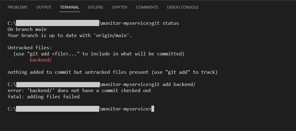 실제로 backend/ 디렉토리로 들어가 확인해보니 자동으로 git init이 되어있는 모습을 확인할 수 있었습니다.