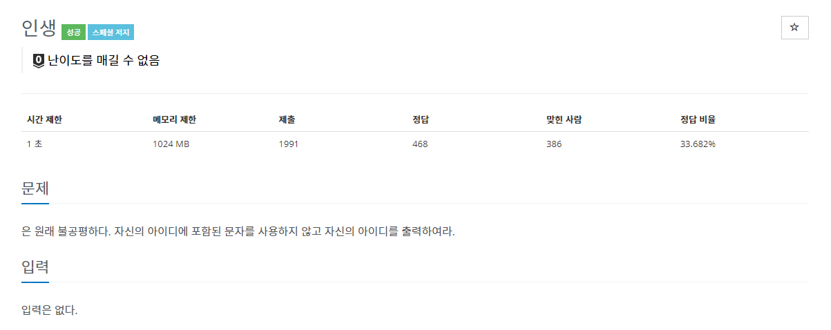의외로 정상적인 제목의 문제인줄 알았으나, 거기서부터 문제가 시작되고 있었습니다. 자신의 아이디에 포함된 문자를 사용하지 않고, 아이디를 출력하는 코드를 작성해야 합니다.