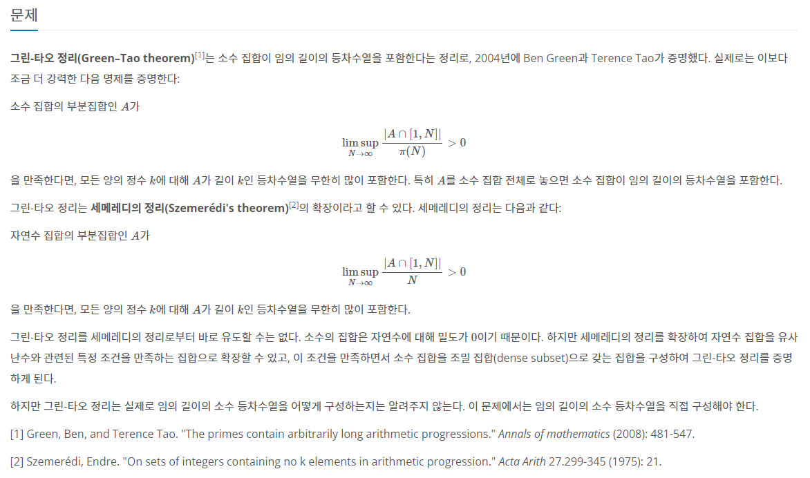 실제로 그린-타오 정리를 이용하여 소수의 등차수열을 구하는 것은 현실적으로 불가능합니다. 에디토리얼에 따르면 전 세계의 컴퓨터가 소수로만 이루어진 등차수열을 구하려는 시도를 했음에도 불구하고 현재까지는 요소가 27인 소수 등차수열만이 발견되었습니다.