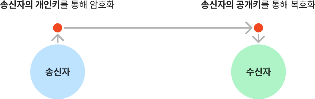 송신자 측에서 정보를 보낼때 본인임을 증명하기 위해 암호화를 적용하고, 이후 수신자 측에서 복호화를 통해 해당 송신자가 맞는지 확인합니다. 여기까지만 보면 공개키와 동일한데, 차이점은 암/복호화에 사용하는 키가 서로 반대라는 점입니다.