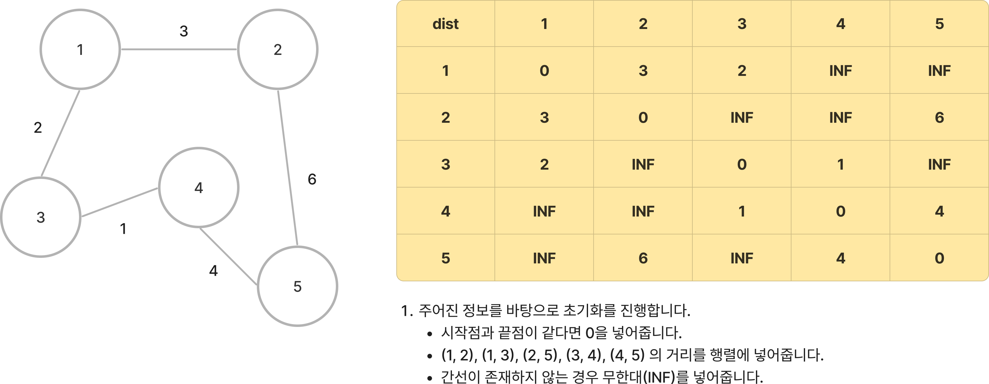 첫 번째 단계는 초기화 단계입니다. 주어진 정보를 토대로 초기 거리 행렬(dist)을 구성해줍니다.