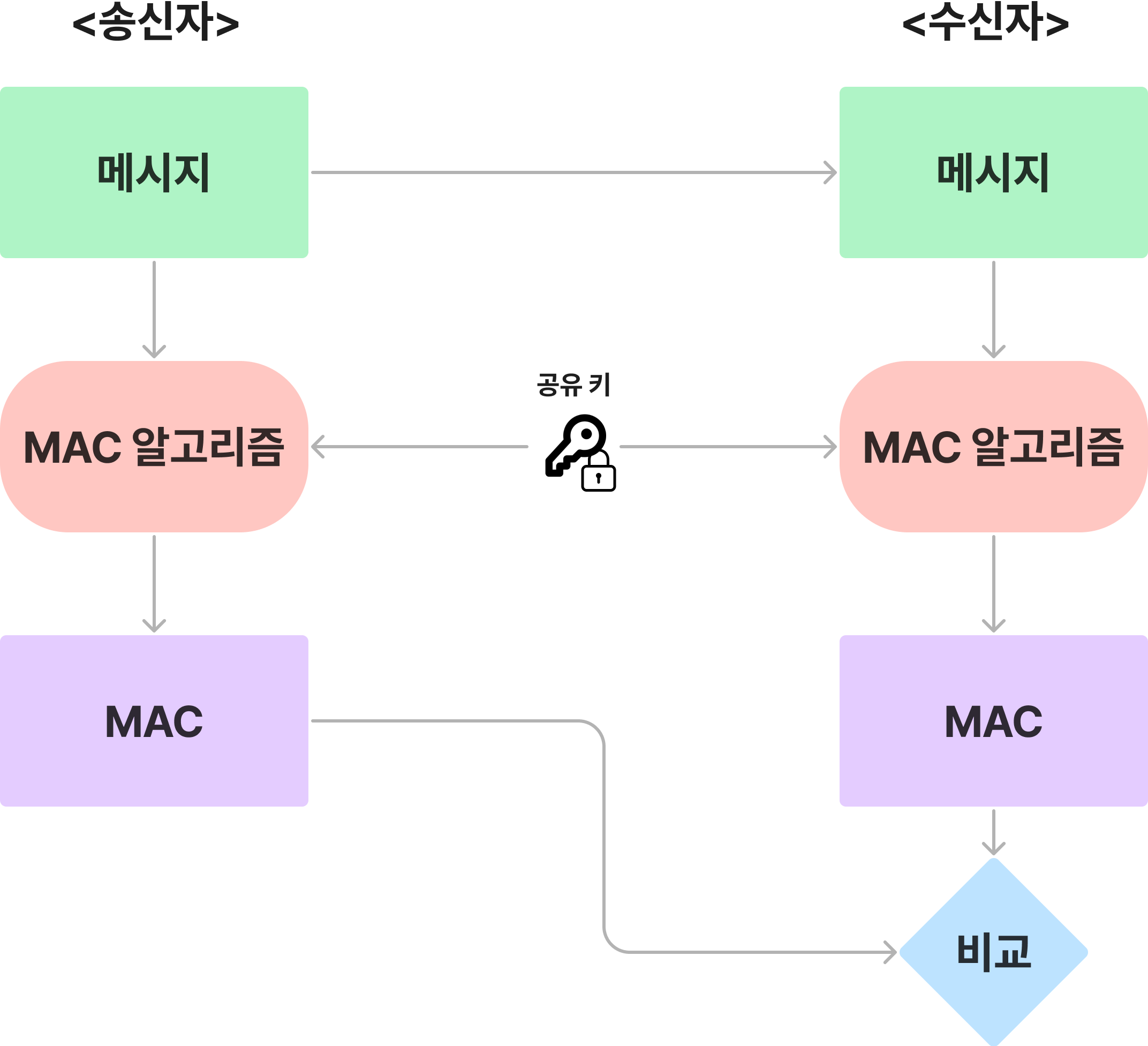 - 메시지 인증 코드(MAC, Message Authentication Code)