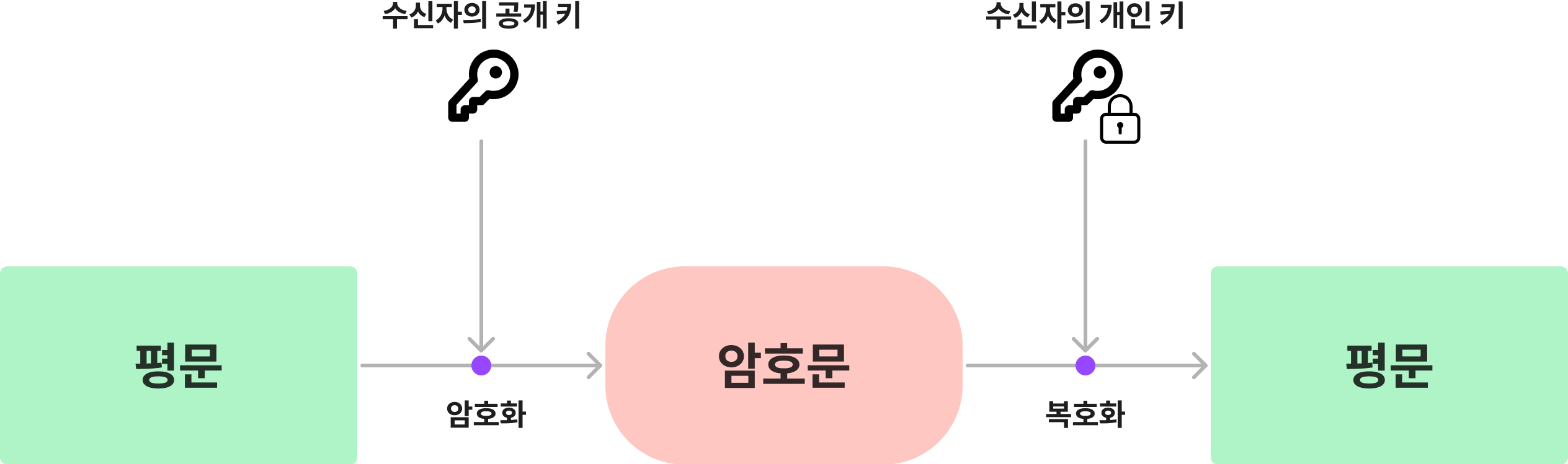 공개 키 암호는 암호화와 복호화에 다른 키를 사용합니다. 송신자가 수신자의 공개 키를 통해 평문을 암호문으로 바꾸고, 수신자는 본인의 개인 키를 통해 암호문에 대한 복호화를 진행합니다. 공개 키로는 암호화만 가능하고, 이를 이용해 암호문을 평문으로 변환할 수는 없기 때문에 수신자의 공개 키는 외부에 노출되어도 괜찮고 그래야만 하지만, 수신자의 개인 키는 대칭 암호 키와 마찬가지로 외부에 노출되어서는 안됩니다.