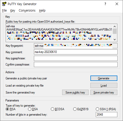 세상에 다양한 암호 알고리즘이 있듯, 키 또한 어떤 암호 알고리즘에 사용되는지에 따라 다양한 종류의 암호 키가 존재합니다. 우리가 이전에 SSH 통신을 하기 위해 PuTTYGen을 통해 만들었던 키의 경우도 RSA 방식의 암호 키였던 것을 확인할 수 있습니다.