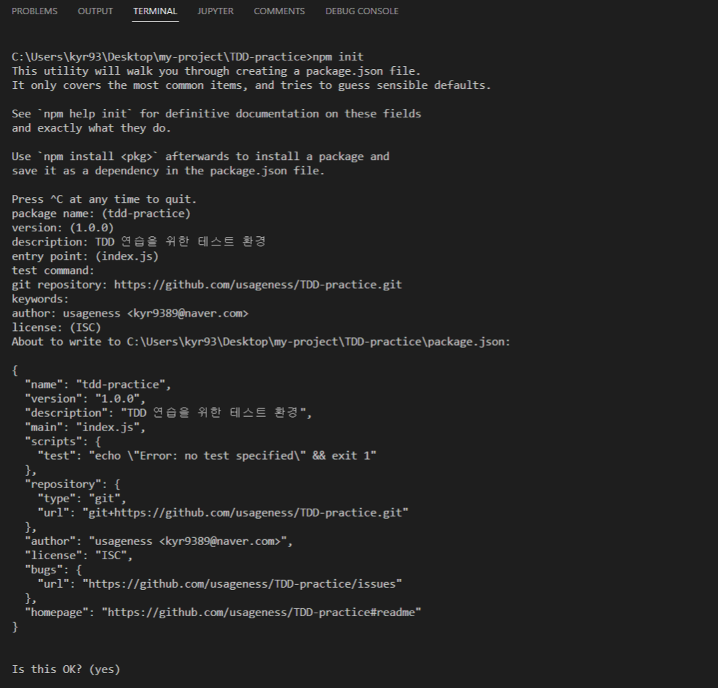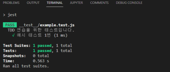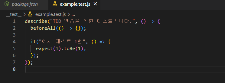 두 예시들은 각각 자바와 파이썬으로 진행되기 때문에, 제가 보기 편하고 익숙한 자바스크립트 코드로 수정하여 직접 타이핑해보는 실습을 병행하겠습니다. 본격적인 TDD에 들어가기 앞서, 테스트 환경을 간단히 구성하겠습니다.