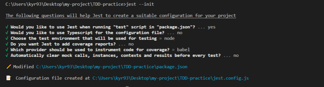 jest가 설치되었다면, init 명령어를 통해 설정 파일을 생성하겠습니다.