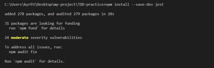 다음으로는 jest 라이브러리를 프로젝트에 설치해줍니다.