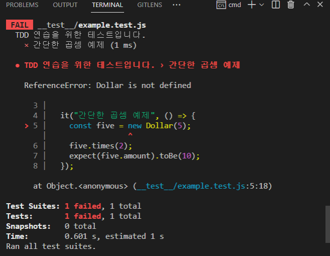간단히 새 Dollar 객체를 반환하도록 변경해주면 될 것 같아 보입니다. 위쪽의 "간단한 곱셈 예제" 테스트는 삭제하고, 테스트를 돌려보겠습니다.