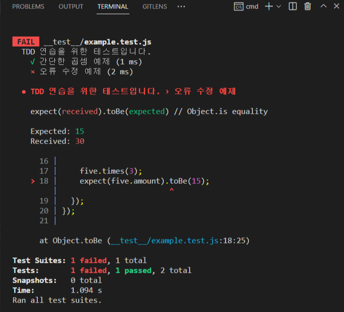 jest에서도 빨간 막대로 에러를 표시해주고 있는 모습입니다. 여기서는 하나의 오류가 발생하며 테스트가 종료되었지만, 이 코드에는 총 네 가지의 잠재적인 오류가 있습니다.